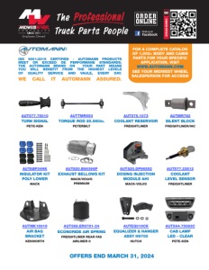 CATALOG NUMBER 00 AUTEQ019CK EQUALIZER & HANGER ASSY H9700 HUTCH AUTMK16916 AIR BAG BRACKET KENWORTH AUT566.ER9781-24 ECONORIDE AIR SPRING FREIGHTLINER REAR FAS AIRLINER II AUT564.75083C CAB LAMP LED - CLEAR PETE-KEN AUTTMR553 TORQUE ROD 25.560in. PETERBILT AUTMR782 SILENT BLOCK FREIGHTLINER/IHC AUT577.75010 TURN SIGNAL PETE-KEN AUT575.1073 COOLANT RESERVOIR FREIGHTLINER AUTABP34HK INSULATOR KIT POLY LOWER MACK AUT577.23512 COOLANT LEVEL SENSOR FREIGHTLINER AUT820.DP96552 DOSING INJECTION MODULE AHI MACK-VOLVO AUT820.B96396P EXHAUST BELLOWS KIT MACK/VOLVO PREMIUM ISO 9001:2015 CERTIFIED - AUTOMANN PRODUCTS MEET OR EXCEED OE PERFORMANE STANDARDS. THE AUTOMANN BRAND ON YOUR PART MEANS YOU WILL BENEFIT FROM THE HIGHEST LEVELS OF QUALITY SERVICE AND VAULE, EVERY DAY. WE CALL IT AUTOMANN ASSURED. FOR A COMPLETE CATALOG OF 1,000+ BODY AND CABIN PARTS FOR YOUR SPECIFIC APPLICATION, VISIT WWW.AUTOMANN.COM SEE YOUR MIDWEST WHEEL SALESPERSON FOR ACCESS! OFFERS END MARCH 31, 2024