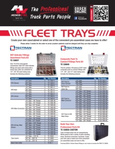 CATALOG NUMBER 00 Composite Push To Connect Fittings Parts Kit TC CAB49 Description Qty. Part Number DOT Push-In Union Connect 1/4" Tube 5 TC QL1362-4 3/8" Tube 5 TC QL1362-6 1/2" Tube 5 TC QL1362-8 DOT Push-In Union Tee 1/4" Tube 5 TC QL1364-4 3/8" Tube 5 TC QL1364-6 DOT Push-In Male Connector 1/4" Tube - 1/8" Thread 5 TC QL1368-4A 1/4" Tube - 1/4" Thread 5 TC QL1368-4B 1/4" Tube - 3/8" Thread 5 TC QL1368-4C 3/8" Tube - 1/8" Thread 5 TC QL1368-6A 3/8" Tube - 1/4" Thread 5 TC QL1368-6B 3/8" Tube - 3/8" Thread 5 TC QL1368-6C 1/2" Tube - 1/4" Thread 5 TC QL1368-8B 1/2" Tube - 3/8" Thread 5 TC QL1368-8C 1/2" Tube - 1/2" Thread 5 TC QL1368-8D DOT Push-In SW Male Elbow 1/4" Tube - 1/8" Thread 5 TC QL1369-4A 1/4" Tube - 1/4" Thread 5 TC QL1369-4B 3/8" Tube - 1/8" Thread 5 TC QL1369-6A 3/8" Tube - 1/4" Thread 5 TC QL1369-6B 3/8" Tube - 3/8" Thread 5 TC QL1369-6C 1/2" Tube - 3/8" Thread 5 TC QL1369-8C DOT Airbrake Fittings Assortment Parts Kit TC CAB27 Description Qty. Part Number NTA Sleeves 1/4" Tube 5 TC 1360-4 3/8" Tube 5 TC 1360-6 1/2" Tube 5 TC 1360-8 NTA-Nuts 1/4" Tube 5 TC 1361-4 3/8" Tube 5 TC 1361-6 1/2" Tube 5 TC 1361-8 NTA-Unions 1/4" Tube 2 TC 1362-4 3/8" Tube 2 TC 1362-6 1/2" Tube 2 TC 1362-8 NTA-Male Connectors 1/4" Tube - 1/8" Thread 2 TC 1368-4A 1/4" Tube - 1/4" Thread 2 TC 1368-4B 3/8" Tube- 1/8" Thread 2 TC 1368-6A 3/8" Tube - 1/4" Thread 2 TC 1368-6B 3/8" Tube - 3/8" Thread 2 TC 1368-6C 1/2" Tube - 1/4" Thread 2 TC 1368-8B 1/2" Tube - 3/8" Thread 2 TC 1368-8C 1/2" Tube - 1/2" Thread 2 TC 1368-8D NTA-90 deg. Male Elbows 1/4" Tube - 1/8" Thread 1 TC 1369-4A 1/4"Tube - 1/4" Thread 1 TC 1369-4B 3/8" Tube - 1//8" Thread 1 TC 1369-6A 3/8" Tube - 1/4" Thread 1 TC 1369-6B 3/8" Tube - 3/8" Thread 1 TC 1369-6C 1/2" Tube - 1/4" Thread 1 TC 1369-8B 1/2" Tube - 3/8" Thread 1 TC 1369-8C 1/2" Tube - 1/2" Thread 1 TC 1369-8D Tube Inserts 1/4" Tube - .170" ID 5 TC 19241 3/8" Od - .250" ID 5 TC 19261 1/2" Od - .376" ID 5 TC 19281 Nylon Tube Cutter 1 TC SC-1 Build Your Own Professional Parts Kit TC CAB58-CUSTOM Case is broken down into 24 compartments. Works great to hold a variety of parts including brass, electrical connectors, terminals. Create your own case or select one of the convenient pre-assembled cases we have to offer. Purchase $300 in Tectran Brass Fittings on one invoice to receive the FREE TC CAB58 Over 70 of the most popular compression-style DOT-rated airbrake fittings and spare parts along with a handy tube cutter are contained for 1/4”, 3/8” OD nylon tubing sizes. Includes the following products: This kit contains 100 pieces of DOT-rated composite push-to-connect fittings with 1/4”, 3/8”, and 1/2” nylon tubing sizes. Includes the following products: FLEET TRAYS Create your own case/cabinet or select one of the convenient pre-assembled cases we have to offer! Please allow 2 weeks for the order to arrive (custom cabinets could be delayed until they can ship complete)