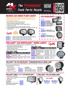 CATALOG NUMBER 00 GR 64G11-5 Pendant Mount Near Pattern GR 64G01-5 Pendant Mount Far Pattern 1790 LUMENS! TRILLIANT® T26 LED WORK LAMP Trilliant® performance in a small, mount-anywhere work lamp Spot Pattern GR 63601 Flood Pattern GR 63611 Flood Pattern - Per-Lux® Housing GR 63741 Trapezoid Lighting Pattern GR 63621 ▪ 50,000 hour LED WhiteLight™ ▪ Greater Lumen output with lower power consumption ▪ Voltage Amp: 12 V - 1.6A ▪ 700 Lumens TRILLIANT® MINI 3" X 5" LED WHITELIGHT™ TRILLIANT® LED WHITELIGHT™ WORK LAMPS TRILLIANT® CUBE P/N Termination Beam Pattern Volts Amps 12 3 3000 Lumens GR 63F61 Amp Superseal Flood 1200 Lumens GR 63991-5 Amp Superseal Wide Flood 10/24 1.4/.7A TRILLIANT® OVAL P/N Termination Beam Pattern Volts Amps 3000 Lumens GR 64W81 Hard Shell Superseal Long Range 12/24 3/1.5 GR 64W91 Hard Shell Superseal Close Range 12/24 3/1.5 GR 64W21 Deutsch DT Long Range 12/24 3/1.5 GR 64W31 Deutsch DT Close Range 12/24 3/1.5 2000 Lumens GR 64W41 Hard Shell Superseal Long Range 12/24 2/1 GR 64W51 Hard Shell Superseal Close Range 12/24 2/1 ▪ Premium LEDs produce white light that reduces eye fatigue and operator stress ▪ Quiet operation & consistent light output ▪ Rugged design withstands heavy vibration, corrosion, moisture, and dust ▪ Sophisticated reflector optics put more light on the task ▪ PAR 36 LED lamp includes a pigtail for hard wired applications ▪ Voltage 10V - 30V ▪ 1.4A AT 12V / .7A AT 24V TRILLIANT® T36 LED WHITELIGHT™ CONVERSION BULB & WORK LAMP 40,000-hour service rating, provides 800 lumens of brilliant LED WhiteLight™ and lasts 100 times longer than incandescent PAR 36 lamps P/N Description Beam Pattern GR 63821-5 PAR 36 LED BULB TRACTORPLUS™ GR 63861-5 PAR 36 LED LAMP w/ Bracket TRACTORPLUS™ GR 63871-5 PAR 36 LED LAMP w/ Bracket WIDE FLOOD HEATED LED SNOW PLOW LIGHTS ▪ Die-cast aluminum housing and heavy-duty lens ▪ Built to resist hours of continuous 6G vibration ▪ Versatile, multi-volt design features reverse voltage protection ▪ Includes LED turn signal ▪ Includes integrated 6-pin DT connector with blunt-cut adapter ▪ Regulations/Standards: FMVSS 571.108; DOT; SAE UB3; LB: SAE LB3V, SAE J577, IP67 ▪ 2 Year Warranty Automatically prevent snow and ice buildup with a sensor that monitors the lens and activates an internal heating element when its temperature falls too low. GR 84661-4 Heated Lens High/Low Beam Head Light, Right & Left-Hand Kit GR 84631-5 Heated Lens High/Low Beam Head Light, Left Hand GR 84641-5 Heated Lens High/Low Beam Head Light, Right Hand 4" X 6" GR 94411-5 High Beam GR 94421-5 Low Beam GR 64J71-5 Heated High Beam GR 64J61-5 Heated Low Beam GR 94401-5 High/Low Beam 5" X 7" GR 90951-5 High/Low Beam GR 64H81-5 Heated High/Low Beam 7" ROUND GR 90941-5 High/Low Beam GR 64H71-5 Heated High/Low Beam LED HEADLIGHTS