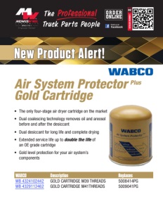 CATALOG NUMBER 02 Air System Protector Plus Gold Cartridge New Product Alert! WABCO Description Replaces 5008414PG WB 4324102442 GOLD CARTRIDGE M39 THREADS WB 4329112462 GOLD CARTRIDGE M41THREADS 5009041PG • The only four-stage air dryer cartridge on the market • Dual coalescing technology removes oil and areosol before and after the desiccant • Dual desiccant for long life and complete drying • Extended service life up to double the life of an OE grade cartridge • Gold level protection for your air system’s components