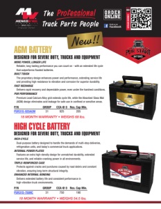 CATALOG NUMBER 03 AGM BATTERY DESIGNED FOR SEVERE DUTY, TRUCKS AND EQUIPMENT HIGH CYCLE BATTERY DESIGNED FOR SEVERE DUTY, TRUCKS AND EQUIPMENT MORE POWER, LONGER LIFE Reliable, long-lasting performance you can count on - with an extended life cycle that outperforms flooded batteries. BUILT TOUGH The proprietary design enhances power and performance, extending service life and providing high resistance to vibration and corrosion for superior durability. FAST RECHARGE Delivers rapid recovery and dependable power, even under the harshest conditions. PUR PERFORMANCE Premium Lead Calcium Alloy grid extends cycle life, while the Absorbed Glass Mat (AGM) design eliminates acid leakage for safe use in confined or sensitive areas. HICH-CYCLE Dual-purpose battery designed to handle the demands of multi-stop deliveries, refrigeration units, and today's commercial truck applications. INTERNAL POWER PLATES Features an extra high-density design for unmatched durability, extended service life, and reliable cranking power in all environments. TRIPLE-REINFORCED CASE Protects against cracks and punctures caused by road debris and constant vibration, ensuring long-term structural integrity. ENHANCED INTERNAL BONDING Delivers extended battery life and consistent performance in high-vibration truck environments. P/N GROUP CCA @ 0 Res. Cap Min. PUR31S-750HC 31 750 190 P/N GROUP CCA @ 0 Res. Cap Min. PUR31S-925AGM 31 925 205 New!! 18 MONTH WARRANTY • WEIGHS 68 lbs. 18 MONTH WARRANTY • WEIGHS 54.5 lbs.