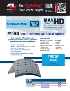 Using a hands on approach and adhering to the highest standards in the industry, Midwest Wheel is leading the way. APPLICATIONS ▪ Tandem Tractor/Trailer ▪ Spread Tandem ▪ Multiple Trailer ▪ Single Tractor/Trailer ▪ Straight Truck ▪ Container Chassis ▪ Livestock Trailer ▪ Car Hauler ▪ Dry Bulk ▪ Tanker ▪ Flat Bed Trailer ▪ Van Trailer ▪ School Bus NEW BRAKE SHOES NEW, NO CORE! ▪ Asbestos-free brake lining ▪ FMVSS121 rated for 23,000 lbs (180 AL Factor) ▪ Good lining and drum wear ▪ Good fade and recovery characteristics ▪ Good stopping power ▪ Excellent flexural strength to resist cracking ▪ Low Swell and Growth 23K STOP BOX WITH NEW SHOES Truck and trailer, OEM quality product specifically designed for multi-use applications formulated for good drum and lining life CATALOG NUMBER 08 REAR Description 23k Price 16.5" x 7" Meritor ZI KSTD234707QP $55.00 16.5" x 7" Eaton ZI KSTD234709E2 $56.00 Ask about our Core Buyback Program 4707QP $55.00