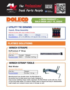 FLATBED SOLUTIONS CATALOG NUMBER 09 Ratchet buckle with vinyl coated S hooks UTILITY TIE DOWNS 4-pack, Strap Assembly Part No.: Size: WLL: Weight: DLC38000015 1” x 15’ 266 lbs / 121 kg 4.7 lbs / 2.13 kg With Flat Hook WINCH STRAPS DoPremium 4” Strap Part No.: Lenght: Weight: DLC23114430 30 ft 7.2 lbs / 3.27 kg Part No.: Weight: DLC23700006 3.3 lbs / 1.5. kg Standard Web Winder Manufactured from durable steel, the Web Winder is the perfect tool to help secure your loads. Designed to keep excess webbing straps neatly organized, the Web Winder works with two, three or four inch wide straps. It is easy to install, easy to remove and easy to disassemble. Light weight and compact means ease of storage as well. WINCH STRAP TOOLS Web Winder — NEW PRODUCT — SALE ENDS JULY 15, 2024!