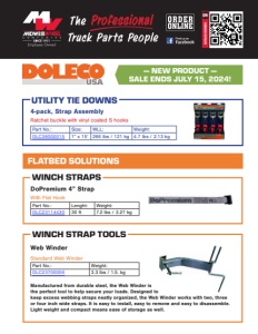 FLATBED SOLUTIONS CATALOG NUMBER 09 Ratchet buckle with vinyl coated S hooks UTILITY TIE DOWNS 4-pack, Strap Assembly Part No.: Size: WLL: Weight: DLC38000015 1” x 15’ 266 lbs / 121 kg 4.7 lbs / 2.13 kg With Flat Hook WINCH STRAPS DoPremium 4” Strap Part No.: Lenght: Weight: DLC23114430 30 ft 7.2 lbs / 3.27 kg Part No.: Weight: DLC23700006 3.3 lbs / 1.5. kg Standard Web Winder Manufactured from durable steel, the Web Winder is the perfect tool to help secure your loads. Designed to keep excess webbing straps neatly organized, the Web Winder works with two, three or four inch wide straps. It is easy to install, easy to remove and easy to disassemble. Light weight and compact means ease of storage as well. WINCH STRAP TOOLS Web Winder — NEW PRODUCT — SALE ENDS JULY 15, 2024!