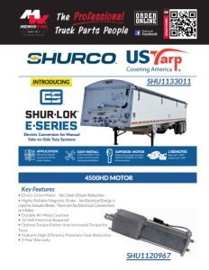 CATALOG NUMBER 09 www. SHURCO.com | 1.800.474.8756 SHUR-CO SPECIAL INTRODUCTORY PRICING APPLICATION Manual to Electric Conversion Kit for Grain Trailers. FEATURES $xxxx Terms & Conditions: Offer valid to 2-28-25. System must be purchased through Shur-Co® Authorized Distributor for special introductory pricing. Take Advantage Of This Offer Through Your Shur-Co® Authorized Distributor P. (000-000-0000) www.website.com Partner Logo INTRODUCING EASY INSTALL Fully assembled front & rear arms for quick and easy installation. SUPERIOR MOTOR Direct drive motor provides superior reliability vs. chain driven motors. Fully Assembled Front/Rear Arms Fully assembled front and rear arm sets allow for quick and easy installation. Universal Mounting Bracket for Vertical/Sloped Trailers SMARTwire™ Sealed Harness Patented sealed connections eliminate failures due to corroded or loose electrical terminals. ShurLink™ EZR™ Remote Best-in-Class reliability and range with Express Mode Operation capabilities. Pre-Wired Sealed Control Box Pre-wired, sealed control box with fully serviceable key components eliminates need for costly full replacement. Direct Drive Motor Superior reliability and performance over chain driven motor. Patented motor brackets eliminate stress in the event of roll tube damage. Electric Conversion for Manual Side-to-Side Tarp Systems Take your grain trailer to the next level with the all-new ShurLok® E-Series, a high-performance, medium-duty electric roll tarp system from Shur-Co®. This premium electric roll tarp conversion kit is specifically engineered to enhance your manual grain trailer tarp, offering seamless efficiency and reliable performance. Upgrade today and experience the difference with the Shur-Lok® E-Series— designed to maximize your tarping capabilities and simplifying your work, all while keeping you safely on the ground. 2 REMOTES ShurLink™ EZR™ & ShurLink™ APP 4500HD MOTOR Key Features •Direct-Drive Motor - No Chain-Driven Reduction •Highly Reliable Magnetic Brake - No Electrical Energy is Used to Actuate Brake, There are No Electrical Connections to Misfire •Durable All-Metal Gearbox •12-Volt Electrical Required •Optimal Torque Rather than Increased Torque for Tarps •Features High-Efficiency Planetary Gear Reduction •3-Year Warranty SHU1133011 SHU1120967