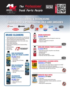CLEANING & DEGREASING LUBRICATING & PENETRATING OILS AND GREASES ENGINE DEGREASER CC 05025 (20 oz.) ▪ Quickly lifts grease & grime off engines for cooler more efficient running ▪ Easy to use - just spray on & rinse off ▪ Leaves no residue. BRAKE CLEANERS NON-CHLORINATED QUICK DRY BRAKE CLEANER NA 4520 (12.5 oz.) ▪ Fast drying formula ▪ Not for sale in CA, UT, DE, NH or OTC states ▪ 98% VOC CHLORINATED BRAKE CLEANER NA 4820 (19 oz.) ▪ Non-Flammable ▪ Not for sale in CA or NJ ▪ 0% VOC NON-CHLORINATED BRAKE CLEANER NA 4620 (14 oz.) ▪ OTC compliant; Not for sale in CA, UT, DE, NH ▪ 45% VOC ▪ Instantly dissolves and removes grease, oil, brake fluid and other contaminants from disc and drum brake components ▪ Superior cleaning power extends beyond brakes ▪ Cleans and degreases brake rotors, drums, pads, shoes, wheel cylinders and parts ▪ Cleans without disassembly ▪ Helps stop brake squeaking and can improve braking performance ▪ Leaves no residue ▪ Non-staining ▪ Quick dry time DEGREASING & CLEANING WIPES MHDBMW-6 (72 wipes) ▪ Longer lasting, super-soaked wipes in a handy pop-up canister ▪ Wipe solutions are proprietary and formulated ▪ Great for hands, tools, equipment, graffiti, adhesives, ink, paint, printing presses, pipe dope, and a lot more MONSTER MULE WIPES MHDMMW-6 (72 wipes) ▪ Gritty Wipes ▪ Great for monstrously tough cleaning tasks. ▪ Perfect for ransportation, industry, agriculture, automotive and home use. ▪ Works great for cleaning hands. CATALOG NUMBER 10 BRKLEEN BRAKE PARTS CLEANER CC 05089 (20 oz.) ▪ Helps brakes last longer and perform more efficiently ▪ Degreasers instantly ▪ Non-flammable ▪ Works without disassembly ▪ Cleans fast, dries fast, leaves no residue