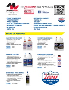 LUC10076 Gallon HEAVY DUTY CK-4 MOTOR OILS 15W-40 MAGNUM HIGH TBN CI-4 OIL Premium oils blended with high quality API Group II and Group III base oils and a cutting-edge additive package providing the robust performance required by modern diesel engines while assuring good fuel economy. Much improved oxidation resistance means this oil lasts longer and protects engines better than previous heavy duty motor oils. They provide excellent soot control and TBN retention as well as shear stability. Lucas SAE 15W-40 Magnum CI-4 oil was designed to last up to twice as long as plain 15W-40 oils. It’s a blend of high quality base oils and an additive package that allows extended drain intervals and a much higher degree of protection from metal to metal contact. It holds much more soot in suspension than conventional 15W-40 oils. Expect less oil consumption and higher oil pressure. It guarantees a cool, quiet performance, a higher degree of lubricity, longer engine life and no dry starts. It is also the perfect lubricant for hard working hydrostat transmissions. LUC10287 SAE 15W-40 CK-4 1 Gallon LUC10288 SAE 15W-40 CK-4 5 Gallon Pail LUC10289 SAE 15W-40 CK-4 55 Gal Drum LUC10292 SAE 15W-40 CK-4 330 Gal Tote LUC11247 Synthetic SAE 15W-40 CK-4 1 Gallon LUC10572 Synthetic SAE 10W-30 CK-4 55 Gal Drum LUC11178 Synthetic SAE 5W-40 CK-4 1 Gallon LUC10019 Quart LUC10018 Gallon HYDRAULIC OIL BOOSTER & STOP LEAK ANTI-WEAR HYDRAULIC OILS SYNTHETIC UNIVERSAL HYDRAULIC & TRANSMISSION FLUID ▪ Stops leaks ▪ Prevents major overhauls ▪ Reduces heat ▪ Increases equipment life ▪ Longer fluid and component life ▪ More hydraulic pressure ▪ Faster response ▪ Smoother operation LUC10017 Gallon LUC10037 5 Gallon Pail LUC10038 55 Gallon Drum ISO 32 LUC10401 5 Gallon ISO 32 LUC10403 55 Gal Drum ISO 46 LUC10404 5 Gallon ISO 68 LUC10409 55 Gal Drum LUC10524 55 Gallon Drum UNIVERSAL HYDRAULIC FLUID ▪ Meets and exceeds all OEM specifications for power shift transmissions ▪ Extends equipment and fluid life ▪ Reduces downtime and major over-haul ▪ Cleaner hydraulic system ▪ Extended fluid life ▪ Less wear-and-tear ▪ Protection of parts made of copper Ask your Midwest Wheel Salesman for details on how to get a FREE pump for your drums and totes! HEAVY DUTY TRUCK OILS HYDRAULICS