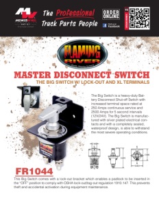 CATALOG NUMBER 15 This Big Switch comes with a lock-out bracket which enables a padlock to be inserted in the “OFF” position to comply with OSHA lock-out/tag-out regulation 1910.147. This prevents theft and accidental activation during equipment maintenance. MASTER DISCONNECT SWITCH FR1044 THE BIG SWITCH W/ LOCK-OUT AND XL TERMINALS The Big Switch is a heavy-duty Battery Disconnect Shut-off Switch with increased terminal space rated at 250 Amps continuous service and 2500 Amps for 5 second intervals (12V/24V). The Big Switch is manufactured with silver plated electrical contacts and with a completely sealed, waterproof design, is able to withstand the most severe operating conditions.