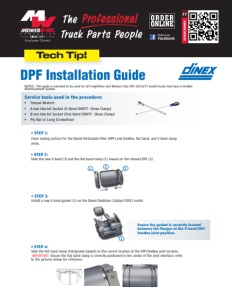 Your Partner in Exhaust and Emission going the extra mile DPF Installation Guide NOTICE: This guide is intended to be used for all Freightliner and Western Star EPA 10/14/17 model trucks that have a OneBox Aftertreatment System. Service tools used in the procedure: • Torque Wrench • 6 mm Hex bit Socket (V-Band DINFIT- Dinex Clamp) • 8 mm Hex bit Socket (Flat-Band DINFIT- Dinex Clamp) • Pry Bar or Long Screwdriver • STEP 1: Clean mating surface for the Diesel Particulate Filter (DPF) and OneBox, flat band, and V-band clamp areas. • STEP 2: Slide the new V-band (3) and the flat band clamp (1) inward on the inboard DPF (2). • STEP 3: Install a new V-band gasket (1) on the Diesel Oxidation Catalyst (DOC) outlet. 1 2 3 Ensure the gasket is correctly located between the flanges at the V-band DPF/ OneBox joint position. 1 DinexEmission.com going the extra mile CATALOG NUMBER 17 Your Partner in Exhaust and Emission going the extra mile DPF Installation Guide NOTICE: This guide is intended to be used for all Freightliner and Western Star EPA 10/14/17 model trucks that have a OneBox Aftertreatment System. Service tools used in the procedure: • Torque Wrench • 6 mm Hex bit Socket (V-Band DINFIT- Dinex Clamp) • 8 mm Hex bit Socket (Flat-Band DINFIT- Dinex Clamp) • Pry Bar or Long Screwdriver • STEP 1: Clean mating surface for the Diesel Particulate Filter (DPF) and OneBox, flat band, and V-band clamp areas. • STEP 2: Slide the new V-band (3) and the flat band clamp (1) inward on the inboard DPF (2). • STEP 3: Install a new V-band gasket (1) on the Diesel Oxidation Catalyst (DOC) outlet. 1 2 3 Ensure the gasket is correctly located between the flanges at the V-band DPF/ OneBox joint position. 1 DinexEmission.com going the extra mile Your Partner in Exhaust and Emission going the extra mile NOTICE: This guide is intended to be used for all Freightliner and Western Star EPA 10/14/17 model trucks that have a OneBox Aftertreatment System. Service tools used in the procedure: • Torque Wrench • 6 mm Hex bit Socket (V-Band DINFIT- Dinex Clamp) • 8 mm Hex bit Socket (Flat-Band DINFIT- Dinex Clamp) • Pry Bar or Long Screwdriver • STEP 1: Clean mating surface for the Diesel Particulate Filter (DPF) and OneBox, flat band, and V-band clamp areas. • STEP 2: Slide the new V-band (3) and the flat band clamp (1) inward on the inboard DPF (2). • STEP 3: Install a new V-band gasket (1) on the Diesel Oxidation Catalyst (DOC) outlet. 1 2 3 Ensure the gasket is correctly located between the flanges at the V-band DPF/ OneBox joint position. 1 DinexEmission.com going the extra mile Your Partner in Exhaust and Emission going the extra mile DPF Installation Guide NOTICE: This guide is intended to be used for all Freightliner and Western Star EPA 10/14/17 model trucks that have a OneBox Aftertreatment System. Service tools used in the procedure: • Torque Wrench • 6 mm Hex bit Socket (V-Band DINFIT- Dinex Clamp) • 8 mm Hex bit Socket (Flat-Band DINFIT- Dinex Clamp) • Pry Bar or Long Screwdriver • STEP 1: Clean mating surface for the Diesel Particulate Filter (DPF) and OneBox, flat band, and V-band clamp areas. • STEP 2: Slide the new V-band (3) and the flat band clamp (1) inward on the inboard DPF (2). • STEP 3: Install a new V-band gasket (1) on the Diesel Oxidation Catalyst (DOC) outlet. 1 2 3 Ensure the gasket is correctly located between the flanges at the V-band DPF/ OneBox joint position. 1 DinexEmission.com going the extra mile Your Partner in Exhaust and Emission going the extra mile DPF Installation Guide NOTICE: This guide is intended to be used for all Freightliner and Western Star EPA 10/14/17 model trucks that have a OneBox Aftertreatment System. Service tools used in the procedure: • Torque Wrench • 6 mm Hex bit Socket (V-Band DINFIT- Dinex Clamp) • 8 mm Hex bit Socket (Flat-Band DINFIT- Dinex Clamp) • Pry Bar or Long Screwdriver • STEP 1: Clean mating surface for the Diesel Particulate Filter (DPF) and OneBox, flat band, and V-band clamp areas. • STEP 2: Slide the new V-band (3) and the flat band clamp (1) inward on the inboard DPF (2). • STEP 3: Install a new V-band gasket (1) on the Diesel Oxidation Catalyst (DOC) outlet. 1 2 3 Ensure the gasket is correctly located between the flanges at the V-band DPF/ OneBox joint position. 1 DinexEmission.com going the extra mile Your Partner in Exhaust and Emission going the extra mile DPF Installation Guide NOTICE: This guide is intended to be used for all Freightliner and Western Star EPA 10/14/17 model trucks that have a OneBox Aftertreatment System. Service tools used in the procedure: • Torque Wrench • 6 mm Hex bit Socket (V-Band DINFIT- Dinex Clamp) • 8 mm Hex bit Socket (Flat-Band DINFIT- Dinex Clamp) • Pry Bar or Long Screwdriver • STEP 1: Clean mating surface for the Diesel Particulate Filter (DPF) and OneBox, flat band, and V-band clamp areas. • STEP 2: Slide the new V-band (3) and the flat band clamp (1) inward on the inboard DPF (2). • STEP 3: Install a new V-band gasket (1) on the Diesel Oxidation Catalyst (DOC) outlet. 1 2 3 Ensure the gasket is correctly located between the flanges at the V-band DPF/ OneBox joint position. 1 DinexEmission.com going the extra mile Your Partner in Exhaust and Emission going the extra mile DPF Installation Guide NOTICE: This guide is intended to be used for all Freightliner and Western Star EPA 10/14/17 model trucks that have a OneBox Aftertreatment System. Service tools used in the procedure: • Torque Wrench • 6 mm Hex bit Socket (V-Band DINFIT- Dinex Clamp) • 8 mm Hex bit Socket (Flat-Band DINFIT- Dinex Clamp) • Pry Bar or Long Screwdriver • STEP 1: Clean mating surface for the Diesel Particulate Filter (DPF) and OneBox, flat band, and V-band clamp areas. • STEP 2: Slide the new V-band (3) and the flat band clamp (1) inward on the inboard DPF (2). • STEP 3: Install a new V-band gasket (1) on the Diesel Oxidation Catalyst (DOC) o
