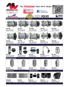ME 1684 OEM# 85120289 ME 5727 2 Gr. 125mm Dia. OEM# 20370291 ME 5726 2 Gr. 132mm Dia. OEM# SD4780 ME 5385 8 Gr. 130mm Dia. OEM# 20388777 ME 5387S 6 Gr. 125mm Dia. OEM# 21349573 ME 5382 2 Gr. 132mm Dia. OEM# 85104593 ME 5385S 8 Gr. 130mm Dia. OEM# 21349570 ME 54732 8 Gr. 180mm Dia. OEM# 82768117 ME 1521 LPM Module OEM# 85120287 ME 7159 OEM# 20447319 ME 1488 OEM# 176230 ME 1560 OEM# 61510-0007 ME 16126 OEM# 82795757 ME 16133 OEM# 82795719 ME 1672 OEM# 85104197 ME 6245A OEM# 21814392 ME 6427 OEM# 22386057 ME 3251 OEM# 3946686 ME 3916 OEM# 85120276 ME 3967 OEM# 85104207 ME 7635 3” by 9” Pad Drier OEM# 82771584 ME 54671 6 Gr. 125mm Dia. OEM# 82768126 ME 5387 6 Gr. 125mm Dia. OEM# 20501069 ME 5404 8 Gr. 180mm Dia. OEM# 20721587 ME 1622 OEM# 20443850 OEM Sanden Compressor - STD & SHD OEM Receiver Driers & Sensors OEM Expansion Valves OEM Condensers OEM Blower Motors CATALOG NUMBER 22 www.midwestwheel.com NLINE www.midwestwheel.com Order NLINE™ 2023 VOLVO
