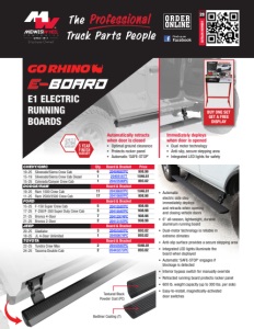ACTIONTRAC™ POWERED RUNNING BOARDS MIDWESTWHEEL.COM MEMBER KANSAS CITY 5801 E. Front St. Main ....(816) 471-1552 Parts....(800) 821-7402 JOPLIN 2424 Stephens Blvd. Main ....(417) 717-6022 Parts....(866) 318-9111 SPRINGFIELD 812 Lillian Dr. ∙ Strafford, MO Main ....(417) 429-2476 Parts....(800) 785-3705 SIOUX CITY 1819 4th St. Main ....(712) 252-7969 Parts....(800) 943-3534 CEDAR RAPIDS 200 50th Ave. S.W. Main ....(319) 365-4453 Parts....(800) 332-5435 DES MOINES 1436 E. Ovid Ave. Main ....(515) 265-1491 Parts....(800) 888-0248 CLEAR LAKE 840 Hwy. 18 W. Main ....(641) 357-7101 Parts....(800) 397-5630 DAVENPORT 8502 Northwest Blvd. Main ....(563) 322-2671 Parts....(800) 553-1886 OMAHA 9770 S 142nd Street, Suite 1 Main ....(531) 239-3050 Parts....(800) 322-8757 NEBRASKA IOWA MISSOURI September 18, 2023 (28Go Rhino E1 Electric Running Boards) CHEVY/GMC Board & Bracket 19-25 Silverado/Sierra Crew Cab 3048315 20-25 Silverado/Sierra Crew Cab 3048315 DODGE/RAM Board & Bracket 19-25 Ram 1500 Crew Cab 3048314 FORD Board & Bracket 19-25 Ranger Crew Cab 3047923 21-25 Bronco 4-Door 3048923 JEEP Board & Bracket 20-25 Gladiator 3047975 18-25 JL 4-Door Unlimited 3036571 07-18 JK 4-Door Unlimited 3036570 ▪ Patented step-within-a-step™ design for easier access, especially on lifted vehicles ▪ Lightweight, corrosion-resistant aluminum ▪ Single, rotary motor for fast, quiet, reliable operation ▪ Integrated LED lights activate on deployment for added visibility and safety ▪ Rated for 650 lbs. static weight capacity (limited to mounting structure) ▪ Simple-2-install™ system with no-splice wiring and no-drill vehicle-specific brackets (excl. some Ram models) ▪ Limited Lifetime Warranty Door Delete Kit 3020000 For applications with the factory doors removed or replaced with half doors It’s a Step-within-a-Step™ STARTING @ $1,032.54