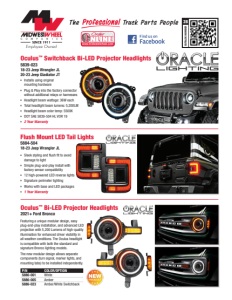 MIDWESTWHEEL.COM MEMBER KANSAS CITY 5801 E. Front St. Main ....(816) 471-1552 Parts....(800) 821-7402 JOPLIN 2424 Stephens Blvd. Main ....(417) 717-6022 Parts....(866) 318-9111 SPRINGFIELD 812 Lillian Dr. ∙ Strafford, MO Main ....(417) 429-2476 Parts....(800) 785-3705 SIOUX CITY 1819 4th St. Main ....(712) 252-7969 Parts....(800) 943-3534 CEDAR RAPIDS 200 50th Ave. S.W. Main ....(319) 365-4453 Parts....(800) 332-5435 DES MOINES 1436 E. Ovid Ave. Main ....(515) 265-1491 Parts....(800) 888-0248 CLEAR LAKE 840 Hwy. 18 W. Main ....(641) 357-7101 Parts....(800) 397-5630 DAVENPORT 8502 Northwest Blvd. Main ....(563) 322-2671 Parts....(800) 553-1886 OMAHA 5822 F St. Main ....(531) 239-3050 Parts....(800) 322-8757 NEBRASKA IOWA MISSOURI September 18, 2023 (28Oracle Lighting) Universal Illuminated LED Letter Badges These individual LED illuminated letters are the perfect way to make your own marquee-style glowing vehicle badge. When turned on, the letters emit a soft edge-lit glow to make your custom badge stand out. Even when off, the sleek design of the letter housings gives a customized high-end appearance. The premium construction and overall styling deliver great value for an easy DIY illuminated badge. Amber LED Backlit BRONCOWA Matte White Letters with Amber LED BRONCOBA Matte Black Letters with Amber LED White LED Backlit BRONCOWW Matte White Letters with White LED BRONCOBW Matte Black Letters with White LED FORD 21-23 Bronco 5892-504 Flush Style LED Tail Lights ▪ Flush mounted to avoid damage to light ▪ Modern sleek design and styling ▪ High-powered LED reverse lights ▪ Signature perimeter lighting ▪ Easy “Plug-&-Play” installation ▪ 1 Year Warranty FORD Carbonized Gray Black 21-23 Bronco 5888-023-MF 5888-023 Integrated Windshield Roof LED Light Bar System ▪ Aerodynamic Integrated Housing Design ▪ High-Powered Lighting 30x 8W LED Main Light ▪ Selectable Amber or White Clearance Lights ▪ Precision LED Reflector-Facing Technology ▪ DIY Install- No Fabrication/ Modification Required ▪ Mounts using Factory Hardware ▪ Under/Over Voltage and Reverse Polarity Protection ▪ Electronic Thermal Management ▪ Innovative Patent-Pending Design ▪ Designed and Engineered in the USA ▪ LED Lifespan 50,000+ Hours ▪ 1 Year Warranty ▪ The LED lighting has a low draw, less than 0.1 Amp per letter. ▪ The overall size is approximately 3.75" wide, 1.4" tall and 0.5" thick. ▪ Installation is easy with the VHB double- stick adhesive. ▪ Wire the letters to a 12V source such as parking lights, ignition fuse, or a separate toggle switch.