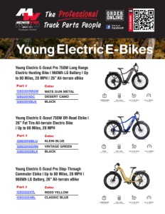 Color Part # 12803010BLU KLEIN BLUE 12803010GRN VINTAGE GREEN 12803002BLK BLACK CATALOG NUMBER 28 Young Electric E-Bikes Young Electric E-Scout Pro 750W Long Range Electric Hunting Bike | 960Wh LG Battery | Up to 80 Miles, 28 MPH | 26’’ All-terrain eBike Young Electric E-Scout Pro Step-Through Commuter Ebike | Up to 80 Miles, 28 MPH | 960Wh LG Battery, 26’’ All-terrain eBike Color Part # 12803011MGM MATE GUN METAL 12803011DC DESERT CAMO 12803011BLK BLACK Color Part # 12803024YL REED YELLOW 12803024BL CLASSIC BLUE Young Electric E-Scout 750W Off-Road Ebike | 26’’ Fat Tire All-terrain Electric Bike | Up to 60 Miles, 28 MPH