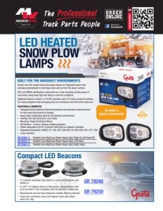 CATALOG NUMBER 29 Compact LED Beacons • 12 customer selectable flash patterns in either of two phases, plus steady-on • S-Link™ 2.0 System allows for flash pattern synchronization with up to ten other S-Link compatible units (for hardwire models only) • Polycarbonate lens and base (Ultrasonic welded); Polarity protected • Three-hole, permanent mount and magnet mount with pattern select aux. plug GR 79240 LED HEATED SNOW PLOW LAMPS BUILT FOR THE HARSHEST ENVIRONMENTS Grote’s new LED heated snow plow lamps feature an integrated sensor that activates automatically to melt away snow and ice from the lamp’s surface. DOT and FMVSS certifications, along with our 2-year warranty, provide peace of mind when using these high-end lamps in extreme conditions. Additional features include 12–30 VDC operation and a DT series connector harness. Our newly designed retail packaging acts as an attractive and informative sales tool. FEATURES & BENEFITS • Integrated sensor detects ambient temperature and activates heating element to melt snow and prevent ice buildup • Heavy-duty construction ideal for the harshest environments • Housing: Die-cast aluminum; Lens: Glass • Mounting: Single Post Swivel Mount • 6G Vibration – 8 hours; Reverse voltage protection • Pigtail: Integrated 6 pin DT connector with blunt-cut adapter (included) • Regulations/Standards: FMVSS 571.108; DOT; SAE UB3; LB: SAE LB3V, SAE J577, IP67 • 2 year warranty GR 84661-4 Heated Lens High/Low Beam Head Light, Right & Left-Hand Kit GR 84631-5 Heated Lens High/Low Beam Head Light, Left Hand GR 84641-5 Heated Lens High/Low Beam Head Light, Right Hand GR 84661-4 Right & Left-Hand Kit GR 79250