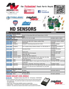 Part# OE Numbers Diesel Injection Control Pressure Sensor AUT577.55611 IHC 25/2600, 30/36/3800, 47/48/4900 50/55i/5600i, 7500, 81/8500 SFC 1830669C91, 1830669C92, 1812818C91, 1812818C92, 1812818C93 Diesel Particulate Filter Sensor PA1050745 Cummins ISX/ISB 2871960, 4984187 Differential Oil Temperature Sensor DR 505-5401 Kenworth/Peterbilt T600A 07-87, T660 07-06, T800 07-87, 379 07-00 Q211002 Differential Temperature Sensor PA1730394 Kenworth/Peterbilt 1/2"-14 NPT / M5 x 0.8 Nut, Flat/Lock Washer K152-247, 140401 Engine Crankcase Pressure Sensor AUT577.23505 Detroit Diesel Series 60 8929387 PA1845069 Mack/Volvo MP7/MP8 21426987, 20513343 AUT577.96520 Volvo D12, D13 (07-13) 21634017, 20499340, 20796744, 20905373, 21746206 Engine Oil Level Sensor PA1853714 Volvo VN, VNL, VT (15-17) 22022794, 21042447, 21521353 Engine Oil Pressure Sensor AUT577.99530 Caterpillar 3-Pin, Cat C10, C12, 3406E, 3176B 1619930, 1414121, 1112350 AUT577.99531 Caterpillar 3-Pin, Cat C7, C9, C10, C11, C12, C13, C15, C16, 3126B, 3126E 1946725, 1619931 AUT577.90501 Cummins Cummins B, C-Series, QSB,ISX 15, ISX 11.9, 2003-2015 4921517 AUT577.90514 Cummins VNL 670 Gen 2 (2003-2019); N14, 1994-2003 4921487, 3080406 DR 904-7109 Cummins ISX 15.0; ISX; ISX-400; ISX-450; ISX-475; ISX-500; ISX-565; 4 3417185, 921475 PA1650676 Detroit Diesel DD15 Engine A0071530828 AUT577.55623 IHC CE Series 1834538C91, 1839412C91, 1839415C91, 1872556C91 AUT577.62519 Mack E7 Engine, MR Series, Vision CNX612, CXN613 64MT286, 20706315, 64MT2114 AUT577.96512 Volvo VHD, VN, VNL, VNM, VT 2003-2008 1077574 Engine Oil Temperature Sensor AUT577.90537 Cummins ISM Coolant, N14 Oil 3865312 PA1730394 Peterbilt 378, 379, 387 17-04184 EGT Temperature Sensor AUT577.90557 Cummins 4902912, 2596660C1, 4700501, 10031031 DNX3FL003 Freightliner/Detroit DOC Outlet A6805402117, A6805402717 DNX3FL004 Freightliner/Detroit SCR Inlet / Outlet A6805401917, A6805402017, A6805402417 DNX3FL005 Freightliner/Detroit DPF Outlet A6805401517 EGR Pressure Feedback Sensor AUT577.90502 Cummins ISB, 06-15, ISC, ISM, ISX 4928594, 4921746, 4087989, 4903479, 3946686 PA1853752 Mack / Volvo 22181342 EGR Temp Sensor AUT577.90532 Cummins Cummins ISX, Dodge 6.7Ltr. 2007.5-2017 2872858, 3865346, 4088832 ESP Sensor AUT577.62520 Mack Volvo VNL 670 Gen 2 (2003-2019) 22443498, 64MT475M, 20449988, 20476992 Fuel Tank Sending Unit DR 285-5401 PACCAR Peterbilt 1987-2019, 26" Dia. Fuel Tank 55491371526, K21-6001-660, K21-6001-661, K21-6004-661 DR 285-5404 PACCAR Kenworth 1987-2017, 24.5" Dia. Fuel Tank w/ Harness 5549-10714-24, 5549-13714-24, Q21-1024-622, Q21-1043-622 DR 285-5406 PACCAR Kenworth 1987-2011, 24.5" Dia. Fuel Tank w/o Harness Q21-1043-622 Fuel Pressure Sensor PA1FSU-0569 Mack Pin Connector, M16 x 1.5 Thread 2289962, 21634024, 20886108, 21634019, 21634021, 20796740, 21302639, 20898038