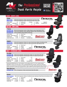 MIDWESTWHEEL.COM MEMBER KANSAS CITY 5801 E. Front St. Main ....(816) 471-1552 Parts....(800) 821-7402 JOPLIN 2424 Stephens Blvd. Main ....(417) 717-6022 Parts....(866) 318-9111 SPRINGFIELD 812 Lillian Dr. ∙ Strafford, MO Main ....(417) 429-2476 Parts....(800) 785-3705 SIOUX CITY 1819 4th St. Main ....(712) 252-7969 Parts....(800) 943-3534 CEDAR RAPIDS 200 50th Ave. S.W. Main ....(319) 365-4453 Parts....(800) 332-5435 DES MOINES 1436 E. Ovid Ave. Main ....(515) 265-1491 Parts....(800) 888-0248 CLEAR LAKE 840 Hwy. 18 W. Main ....(641) 357-7101 Parts....(800) 397-5630 DAVENPORT 8502 Northwest Blvd. Main ....(563) 322-2671 Parts....(800) 553-1886 OMAHA 5822 F St. Main ....(531) 239-3050 Parts....(800) 322-8757 NEBRASKA IOWA MISSOURI BEST - PREMIUM FRED Refresh Kit for Bostrom T Series, Baja, LSO & Wide Ride Freshen your Ride. Experience the Difference. Our FRED refresh kit is a fast way to return your seat to like new condition, helping to reduce discomfort and fatigue from sitting on holes and misshapen surfaces. Tools Required • Socket wrench • 15mm socket • Wire cutters • Phillips screw driver • Hammer Description P/N FRED Refresh Kit, Pro Ride Hi Back BS 6222400-XXX Long 17” Pro Ride style arms* BS 1234480-XXX Standard 15” T Series style arms* BS 1234231-XXX *Armrests are not included in FRED Refresh Kits. Please purchase arms separately as needed: left, right or both. Both arms are interchangeable left / right. Replace -XXX with the material - color code: Color Titan Cloth Black K85 Gray K86 Blue L76 • Back foam • Back cover • Cushion foam • Cushion cover Kits Include Additional Tools for Armrests • 1.5" hole saw • Common screw driver Cushion Width 23" Armrests (adjustable) 16" Isolating HP3 Susp. 6" Travel Serta Cool Gel Foam (topper) Cushion Adj. 8 Position Wide Ride + Serta BS 5300001-900 HiPro Air Suspension, Bellows, Hi-Back, Dual Armrests, Black Ultra-Leather BS 5300001-K85 HiPro Air Suspension, Bellows, Hi-Back, Dual Armrests, Black Titan Cloth BS 5300001-L84 HiPro Air Suspension, Bellows, Hi-Back, Dual Armrests, Black/Gray Titan Cloth Color Titan Cloth Brown K66 Tan K87 Red L75 Track Travel 9.5" Recline 71° Lumbar Dual Air Bolster Cushion & Back Air Structure Flex Mat/Frame April 11, 2023 (35Bostrom and National Seat Catalog) REPAIR PARTS & ACCESSORIES Bostrom BS 6222215-001 KIT ADAPTER PLATE NAVISTR BS 1234231-550 ADJ ARMRST AY BLK BC 1/C T ARMREST BS 1234480-550 ARMRST PR AY BLK BC BS 1234480-552 ARMRST PR AY GRY BC BS 6222400-K85 FRED KIT BLK CLTH National NSCSK-1660 FORD MEDIUM DUTY AFT KIT NSC229697-01 AIRVALVE AY HI-PRESSUR RD NSC229697-05 AIRVALVE AY LO-PRESSUR GRY NSC230930-15 CVR CSH BLK CLTH NSC324764-01 HAND PUMP ASSEMBLY NSC232098-01 SWITCH-SQUARE BUTTON-BK CYCL PART NSC235230-32 U-ARM RH GRAY MORDURA CVG TRUCK-TOUGHTM PREMIUM ACCESSORIES PRODUCTS DRIVEN BY INNOVATION TRUCK-TOUGHTM ADAPTOR PLATE KIT • Innovative, dual-plate mounting system for easy and fast installation • Designed to allow a wide range of our top selling Bostrom and National HiPro Air Suspension Seats to fit into multiple makes and models* • Easy to stock, one part number adaptor solution • Mounting hardware included • WWW.CVGRP.COM | 1-800-459-7328 TRUCK SEAT ADAPTOR PLATE Simplify Air Suspension Seat Installations ® FITS: *See fitment guide on back for complete list P/N Description NSCSK-1685 TRUCK-TOUGH ADAPTOR PLATE KIT Multi-Application Truck Seat Adaptor Plate In M ® FITS: Bulletin Number NS.8015.120123 Published December 1, 2023 Effective December 1, 2023 Subject New Product Launch: CVG Truck-ToughT Commercial Vehicle Group (CVG) is excited to unveil the latest addition to our produc Adaptor Plate Kit (part number: SK-1685). Now available to order, these adaptors are range of all-makes aftermarket truck accessories. The Truck-Tough Adaptor Plate Kit, features a compact, patent-pending design which integration of CVG’s extensive line-up of HiPro air suspension seats into various truck innovative dual-plate mounting system ensures a quick installation process for installe Furthermore, the dual-plate mounting system is adaptable to a variety of configuration application, streamlining the management of kits and reducing the number of adaptor inventory. Now, with Truck-Tough, you only need one kit and one part number for mos For any inquiries, kindly reach out to your local sales representative or contact our cu 1-800-459-7328. Thank you for choosing CVG – where innovation meets reliability. PRODUCTS DRIVEN BY INNOVATION WWW.CVGRP.COM | 1-800-459-7328 PRODUCTB SKU : Description: SK-1685 Truck-Tough Adaptor Plate Kit •Most popular National and Bostrom Hi-Pro Truck Air Suspension Seats: Ensign, Captain, Corsair, Commodore, Admiral T-Series, Pro Ride, Wide Ride •Works with the following trucks: Peterbilt 579, 589 / Kenworth T680, T880 / Volvo VNR, VNL / International Pro Star, Lone Star, NGV, and LT Installation Guide Scan Here Installation Video Scan Here