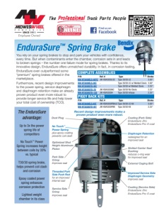 SPRING BRAKE CHAMBERS, CONTINUED SERVICE CHAMBERS P/N Type Stroke PRLSC09HDA Type 9 1.75” K7 KSC12 Type 12 1.75” K7 KSC16 Type 16 2.25” K7 KSC20 Type 20 2.25” AK SC20 Type 20 2.25” PRLSC20LSHDA Type 20 XL 3.00” K7 KSC24 Type 24 2.25” PRLSC24HDA Type 24 LS 2.50” PRLSC24LSHDA Type 24 XL 3.00” K7 KSC30 Type 30 2.50” PRLSC30LSHDA Type 30 XL 3.00” PRLSC36HDA Type 36 3.00” PIGGY BACK KITS P/N Type Stroke PRLPS2024HDA Type 20/24 2.50" PRLPLBPS2424K Type 24/24 Kit 2.50" PRLPLBPS2424KLS* Type 24/24 LS Kit 2.50" PRLPLBPS2430K Type 24/30 Kit 2.50" PRLPLBPS2430KLS Type 24/30 LS Kit 3.00" PRLPS3036HDA Type 30/36 2.50" PRLPLBPS-3036KLS Type 30/36 LS Kit 3.00" PRLPLBPS3636 Type 36/36 3.00" COMPLETE ASSEMBLIES P/N Type Stroke PRL2024HDA Type 20/24 2.50" PRL2424HDA Type 24/24 2.50" PRL2424LSHDA* Type 24/24 LS 2.50" PRL2430HDA Type 24/30 2.50" PRL2430LSHDA* Type 24/30 LS 3.00" PRL3036HDA Type 30/36 2.50" PRLPLBTS3036LS Type 30/36 LS 3.00" PRL3636-2.5 Type 36/36 2.50" PRL3636HDA Type 36/36 3.00" HDA * “L” suffix chambers have the heavier return spring inside to accommodate the long stroke application AIR DISC BRAKE CHAMBERS P/N Type Application BW K028039 Chamber T14 Truck Universal BW K028226 Chamber T16 Truck Universal BW K028022 Chamber T18 Truck Universal BW K028225 Chamber T20 Truck Universal BW K028252 Chamber T24 Truck Universal BW K042457 Chamber 16/24 Universal BW K132352 Chamber 18/24 Universal BW K041960 Chamber 20/24 Universal PRLPL1624.D Economy Chamber 16/24 Universal PRLPL1824.D Economy Chamber 18/24 Universal PRLPL2024.D Economy Chamber 20/24 Universal WB 9253470060 Tristop 18/24 DDSB Disc Brake UNHANDED MAXX 22T: AAL, AAEDL, AAEDT, AANLS WB 9253470070 Tristop 18/24 DDSB Disc Brake LEFT HANDED MAXX 22T: AAT, AANT WB 9253470080 Tristop 18/24 DDSB Disc Brake RIGHT HANDED MAXX 22T: AAT, AANT WB 9253800200 Tristop 20/24 DDSB Disc Brake UNHANDED PAN22: AAL, AAEDL, AAEDT, AANLS WB 9253800210 Tristop 20/24 DDSB Disc Brake LEFT HANDED PAN22: AAT, AANT WB 9253800220 Tristop 20/24 DDSB Disc Brake RIGHT HANDED PAN22: AAT, AANT BW K132352 CLEVIS P/N Type PRL30CL1/2HDA Clevis Forged 1/2” Pin 1/2-20 PRL30CLHDA Clevis Forged 1/2” Pin 5/8-18 PRL30CL5/8HDA Clevis Forged 5/8” Pin 5/8-18 PRLPL1/2PIN Clevis Pin 1/2” PRL5/8PINHDA Clevis Pin 5/8” RI R810019 Std Stroke Straight 5/8" RI R810021 Long Stroke Straight 5/8" RI R810025 Std Stroke 5/8" Offset AUT179.YK5012 For Type 9,12,16 Straight RI R810024 For Type 9,12,16 5/8 Offset DIAPHRAGMS P/N Type Stroke AUT179.DT9 Type 9 1.75” AUT179.DT12 Type 12 1.75” AUT179.DT16 Type 16 2.25” AUT179.DT20 Type 20 2.25” AUT179.DT24 Type 24/L 2.25” AUT179.DT20L Type 20L 2.50” AUT179.DT30 Type 30 2.50" AUT179.DT24XL Type 24XL 3.00” AUT179.DT30 Type 30 2.50” PRLD303HDA Type 30L 3.00” AUT179.DT36 Type 36 3.00” https://youtu.be/XVmRCPSVQrM TECH Tips TRUCK SPRING CAGE BOLT SOCKET P/N MEDLIS-49000 Quickly Unlocks Truck Air Brakes • Extra deep 3/4" socket loosens the cage bolt to unlock air brakes on trucks • Also removes the air brake booster for replacement • Use with a 1/2" drive or 7/8" hex • Can be used with an impact wrench CAGING BRAKE CHAMBERS Garage Guru Ken Boyer walks you through the steps of caging brake chambers for heavy duty brake systems.