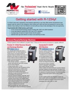 CATALOG NUMBER 37 www.midwestwheel.com NLINE www.midwestwheel.com Order NLINE™ Getting started with R-1234yf R-1234yf is here and it represents a new business opportunity in your shop. Most vehicle manufacturers have already made the switch to this refrigerant, which means you'll need new tools and equipment to service these vehicles. Keep reading to learn how Robinair can best outfit your shop to take advantage of this new opportunity. To get started with 1234yf service, you'll need: » A new recover/recycle/recharge machine meeting SAE J2927 and J2843 standards » A new leak detector meeting SAE J2913 and J2791 standards » A syringe-type oil injector to inject oil back into the system » Optional tracer gas leak detector to reduce cost searching for leaks Recover/Recycle/Recharge Machines 1234yf systems have different couplers than r134a and the service procedure is slightly different. Premier R-1234yf Recover, Recycle and Recharge Machine P/N ISNAC1234-4 Connected R-1234YF ACS Machine P/N ISNROBAC1234-9 Fully automatic ACS machine that meets or exceeds SAE J2927 and J2843 standards for 1234yf recovery. The machine includes an integrated refrigerant identifier that samples the refrigerant in the vehicle’s A/C system prior to recovery. Highly accurate and reliable machine capable of servicing both standard and highvoltage vehicle A/C systems. • Fully automatic operation — program for service, walk away and return when complete • 98.5% recovery efficiency • Charge accuracy within +/- ½ oz • Automatic internal tank refill. No stopping to fill the internal tank during service, or before service • Automatic oil drain shows how much oil was removed from the system during service • Automatic air purge removes the potential of air accumulating in the internal tank • Integrated refrigerant identifier (meets SAE J2927) • Programmable vacuum operation helps get to the necessary vacuum level in any condition quickly • System leak test to identify gross leaks in a system • Liquid refrigerant flushing function can flush A/C systems or individual components using liquid refrigerant instead of harsh chemicals • Meets and exceeds SAE J2843 requirement for R-1234YF Recover, Recycle and Recharge equipment Recovers, recycles, evacuates, leak-tests and recharges R-1234yf with improved 98.5% efficiency – unmatched by any competitor. The new design features a large 10” capacitive touch LCD display, and automated features including automatic internal refrigerant refill, oil drain and refrigerant identification. Also boasts full wireless capabilities for Wi-Fi or Bluetooth® communication, which enables automatic machine software updates and optional refrigerant capacities database downloads, database purchased separately. Use Mopria Print Service wireless printing to print A/C service summary reports for customers or insurance companies. The Android operating system can also export service reports to store or share digitally. The Wi-Fi-capable machine also effectively manages and stores machine metrics and data related to services performed with the ACS machine to include in vehicle service reports. Certifications: SAE J2843, J2927, UL 1963