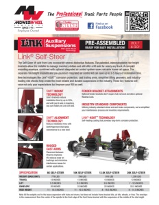 Link® Self-Steer The Self-Steer lift axle from Link incorporate several distinctive features. The patented, interchangeable ride height brackets allow the installer to manage inventory dollars and still offer a lift axle for nearly any truck. A compact mounting envelope, combined with optional integrated air control system saves valuable frame rail space. The separate ride height brackets and pre-plumbed integrated air control kit can save up to 3-5 hours of installation time. New technologies like Link®-KOAT™ corrosion protection, cast trailing arms, simplified lifting geometry, and industryleading ride shocks help create the most reliable and durable suspensions in the industry. These key features will raise not only your expectations but improve your ROI as well. SWIFT MOUNT TECHNOLOGY Link’s brackets reduce installation time by up to 20%, and with just 4 sets in inventory, you can install any Link Lift Axle. FENDER BRACKET ATTACHMENTS Optional fender brackets don’t require hub removal and allow optional Reverse Lock. SWIFT ALIGNMENT TECHNOLOGY Reduce installation time with Swift Alignment that takes convenience to a new level. INDUSTRY-STANDARD COMPONENTS Utilizing industry-standard wheel end and brake components, we’ve simplified your maintenance process and inventory requirements. RUGGED CAST ARMS Placement between lift arms improves lift, reduces wear on bushings and minimizes interference issues for certain applications. LINK®-KOAT™ TECHNOLOGY Self-healing coating that provides long-term corrosion protection. SPECIFICATION 8K SELF-STEER 10K SELF-STEER 13.5K SELF-STEER 20K SELF-STEER WEIGHT (BASE UNIT) 776 LBS 796 LBS 916 LBS 1,300 LBS TRAVEL 13 INCHES 13 INCHES 13 INCHES 12 INCHES LIFT 9.5 INCHES 9.5 INCHES 9.5 INCHES 7 - 9.5 INCHES ENVELOPE 22 INCHES 22 INCHES 22 INCHES 22.5 INCHES RIDE HEIGHT 11 - 19.5 INCHES 11 - 19.5 INCHES 8 - 16.5 INCHES 8 - 14.5 INCHES Note: All the weights are for the base suspension with hubs and drums, but does not include frame bracket kits, air kits, wheels, or tires. The envelope is the measurement from the center of the spindle to the front edge of the front frame bracket with the suspension at the middle of the ride height. PRE-ASSEMBLED READY FOR EASY INSTALLATION! BOLT & GO! CATALOG NUMBER 38 www.midwestwheel.com NLINE www.midwestwheel.com Order NLINE™