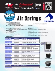 MIDWESTWHEEL.COM MEMBER KANSAS CITY 5801 E. Front St. Main ....(816) 471-1552 Parts....(800) 821-7402 JOPLIN 2424 Stephens Blvd. Main ....(417) 717-6022 Parts....(866) 318-9111 SPRINGFIELD 812 Lillian Dr. ∙ Strafford, MO Main ....(417) 429-2476 Parts....(800) 785-3705 SIOUX CITY 1819 4th St. Main ....(712) 252-7969 Parts....(800) 943-3534 CEDAR RAPIDS 200 50th Ave. S.W. Main ....(319) 365-4453 Parts....(800) 332-5435 DES MOINES 1436 E. Ovid Ave. Main ....(515) 265-1491 Parts....(800) 888-0248 CLEAR LAKE 840 Hwy. 18 W. Main ....(641) 357-7101 Parts....(800) 397-5630 DAVENPORT 8502 Northwest Blvd. Main ....(563) 322-2671 Parts....(800) 553-1886 OMAHA 9770 S 142nd Street, Suite 1 Main ....(531) 239-3050 Parts....(800) 322-8757 NEBRASKA IOWA MISSOURI September 16, 2025 (38Sampa Air Springs) Sampa Part# Application Interchanges SAMSP 559270-K VOLVO / MACK 85101147 / W01-358-9270 / 1R13-077 / 1R13-102 SAMSP 558829-KP VOLVO / MACK 20505399 / 57QL54M / W01-358-8829 / 1R12-615 Sampa Part# Application Interchanges SAMSP 558864-KP PACCAR (PETERBILT/ KENWORTH) 03-08716 / W01-358-8864 / 1R12-1097 SAM500.903-01 PACCAR (PETERBILT/ KENWORTH) 29-02454 / 29-03200 / W02-358-7036 / 1S5-186 SAMSP 558852-KP PACCAR (PETERBILT/ KENWORTH) 03-07887 / W01-358-8852 / 1R12-568 SAM503.477 PACCAR (PETERBILT/ KENWORTH) B816023 / W26-358-9933 SAMSP 558813-KP PACCAR (PETERBILT/ KENWORTH) C81-1003 / C81-6000 / W01-358-8813 / 1R12-1204 SAMSP 559622-K PACCAR (PETERBILT/ KENWORTH) K-303-22 S1 / W01-358-9622 / 1R11-221 SAMSP 559422-KP PACCAR (PETERBILT/ KENWORTH) K-303-14 / K-303-15 / W01-358-9422 / 1R11-028 SP 558813-KP SP 558864-KP SP 559270-K Sampa Part# Application Interchanges SAMSP 559974-KA NEWAY 90557332 / W01-358-9974 / 1R12-1048 SAMSP 558152-KP NEWAY 90557342 SAMSP 559935-KP NEWAY 90557157 / W01-358-9935 / 1R12-532 SAMSP 559807-KP NEWAY 50857000 / W01-358-9807 / 1R12-1047 SP 559935-KP SP 559974-KA Sampa Part# Application Interchanges SAMSP 551191-KP NAVISTAR 3541731C1 / W01-358-1191 / W01-358-9875 / 1R12-432 SAMSP 559648-KP NAVISTAR 2027911C2 / W01-358-9648 / 1R12-538 SP 551191-KP