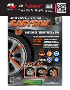 MIDWESTWHEEL.COM MEMBER KANSAS CITY 5801 E. Front St. Main ....(816) 471-1552 Parts....(800) 821-7402 JOPLIN 2424 Stephens Blvd. Main ....(417) 717-6022 Parts....(866) 318-9111 SPRINGFIELD 812 Lillian Dr. ∙ Strafford, MO Main ....(417) 429-2476 Parts....(800) 785-3705 SIOUX CITY 1819 4th St. Main ....(712) 252-7969 Parts....(800) 943-3534 CEDAR RAPIDS 200 50th Ave. S.W. Main ....(319) 365-4453 Parts....(800) 332-5435 DES MOINES 1436 E. Ovid Ave. Main ....(515) 265-1491 Parts....(800) 888-0248 CLEAR LAKE 840 Hwy. 18 W. Main ....(641) 357-7101 Parts....(800) 397-5630 DAVENPORT 8502 Northwest Blvd. Main ....(563) 322-2671 Parts....(800) 553-1886 OMAHA 9770 S 142nd Street, Suite 1 Main ....(531) 239-3050 Parts....(800) 322-8757 NEBRASKA IOWA MISSOURI September 30, 2025 (39EasySox P_LT Flyer) WWW.EASYSOX.COM Quick and Easy to Install PASSENGER / LIGHT TRUCK & SUV EASY INSTALLATION: INSTALL EASYSOX IN A SAFE PLACE AWAY FROM TRAFFIC. AFTER BRINGING VEHICLE TO A COMPLETE STOP, PUT VEHICLE IN PARK, TURN OFF ENGINE AND ENGAGE EMERGENCY BRAKE. LAY EASYSOX OVER THE DRIVE AXLE TIRES. STARTING FROM THE TOP OF THE TIRE, WORK THE EASYSOX OVER THE TREADFACE AND WRAP OVER THE INNER SIDEWALL OF THE TIRE, WORKING YOUR WAY DOWN TOWARD THE ROAD SURFACE. PULL VEHICLE FORWARD (ABOUT A HALF REVOLUTION OF TIRE) UNTIL THE TIRE IS RESTING ON THE TOP OF THE MOUNTED SECTION OF THE EASYSOX. CONTINUE TO PULL THE FABRIC OVER THE INNER SIDEWALL UNTIL IT IS EVENLY DISTRIBUTED AROUND THE ENTIRE TIRE. IT’S JUST THAT EASY! EASYSOX TIPS: • ACCELERATE SLOWLY. • DO NOT BRAKE HARD. • DO NOT SPIN TIRES WHILE EASYSOX ARE MOUNTED AS IT MAY DAMAGE THE FABRIC. • MAKE SURE EASYSOX ARE TEST FITTED BEFORE FIRST USE. • EASYSOX ARE RECOMMENDED FOR SHORT DISTANCE DRIVING ONLY. • CHECK EASYSOX PERIODICALLY FOR WEAR AND PROPER PLACEMENT. • FOR SAFER OPERATION, EASYSOX CAN BE INSTALLED ON ALL WHEEL POSITIONS OF VEHICLE. • DO NOT PARK FOR EXTENDED PERIODS WITH EASYSOX MOUNTED AS THEY MAY FREEZE TO THE ROAD. • AFTER EACH USE LAY EASYSOX OUT TO DRY BEFORE RETURNING TO BAG FOR STORAGE. • WHEN THE FABRIC ON THE TREAD FACE IS MORE THAN 50% WORN, REMOVE AND DISCARD IN A PROPER RECEPTACLE. PASSENGER & LIGHT TRUCK / SUV ES72 ES73 ES74 ES75 ES76 ES77 ES78 ES79 185/70-13; 195/60-14; 185/65-14 175/70-14; 195/55-15; 185/60-15 205/70-14; 215/60-15; 195/65-15 165/80-15; 215/55-16; 255/40-17 235/45-17; 205/50-17; 255/35-18 225/40-18; 255/30-19; 185-14 225/65-15; 205/70-15; 215/70-15 225/60-16; 205/65-16; 215/65-16 215/55-17; 225/55-17; 235/45-18 195/60-17; 195/50-19 215/75-14; 225/70-15; 205/75-15 235/60-16; 235/55-17; 215/60-17 245/45-18; 225/50-18; 235/50-18 215/55-18; 245/40-19; 255/40-19 245/35-20; 255/35-20 205/50-15; 205/45-16; 195/50-16 205/40-17 175/80-13; 185/70-14; 195/60-15 175/65-15; 185/65-15; 205/50-16 185/55-16; 195/55-16; 225/40-17 195/70-14; 205/60-15; 225/50-16 205/55-16; 245/40-17; 215/45-17 215/40-18 215/70-14; 195/75-14; 205/75-14 225/60-15; 235/60-15; 205/65-15 215/65-15; 245/50-16; 225/55-16 205/60-16; 215/60-16; 245/45-17 215/50-17; 225/50-17; 235/50-17 235/40-18; 245/40-18; 225/45-18 235/35-19; 255/35-19 215/75-15; 225/75-15; 225/65-16 235/65-16; 215/70-16; 225/60-17 235/60-17; 215/65-17; 225/55-18 245/45-19; 245/40-20; 325/30-19 155/80-13; 185/60-14; 175/65-14 195/50-15; 185/55-15 235/75-15; 215/75-16; 225/75-16 225/65-17; 255/55-18; 225/60-18 235/60-18; 255/50-19; 225/55-19 235/55-19; 245/45-20; 255/45-20 275/60-15; 275/60-16; 245/70-16 245/65-17; 245/60-18; 245/55-19 275/45-20; 245/50-20; 265/35-22 255/70-16; 265/70-16; 245/75-16 235/80-16; 215/85-16; 265/60-17 265/65-17; 235/70-17; 235/75-17 265/60-18; 235/55-20; 245/45-21 265/30-22; 275/35-22; 235/60-19 255/65-18; 255/60-19; 255/55-20 285/70-16; 265/75-16; 245/70-17 265/70-17; 245/75-17; 235/80-17 285/60-18; 265/65-18; 255/70-18 285/50-20; 235/85-16; 255/50-20 265/50-20; 31X10.50-15 225/70-19.5 285/70-17; 285/65-18; 265/70-18 305/50-20; 275/55-20; 285/55-20 325/35-22; 275/65-18; 285/45-22 275/55-21; 275/50-22 ES80 ES81 ES82 ES83 ES84 ES85 EASYSOX NUMBER EASYSOX NUMBER TIRE SIZE TIRE SIZE FITMENT CHART PLEASE NOTE: This is a guide only. Actual tments and clearances may vary. Please check prior to use.