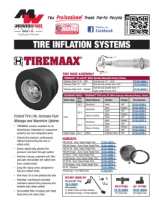 TIRE INFLATION SYSTEMS CATALOG NUMBER 39 www.midwestwheel.com Order NLINE™ www.midwestwheel.com Order NLINE™ TEE FITTING TN VS-29854 For Dual Tires 90° FITTING TN VS-30002 For Single Tires ROTARY UNION KIT No Spindle Plug TN S-28622 Kit Includes: (1) Rotary Union, (2) Hose Clamps, (4) Machine Screws, (1) Hose Adaptor • TIREMAAX solution available for all Hendrickson integrated air suspension systems and non-integrated axles • Checks tire pressure continuously without pressurizing the axle or wheel-ends • Check valves help prevent tire pressure loss back through system • Ventless hubcap, patented axle filter and axle vent protect the wheel-end from contaminants • Long-life rotary union, designed to last one million miles • Axle hose, for a non-pressurized axle • Patented, mechanical controller maintains desired tire pressures and isolates tires when parked • Serviceable filter at supply port helps keep lines and seals clean HUBCAPS PRO HN Oil - Dual / Super Single Tires TN VS-32055-1 PRO HN Grease - Dual / Super Single Tires TN VS-32055-3 PRO HP Oil - Dual / Super Single Tires TN VS-32056-1 PRO HP Grease - Dual / Super Single Tires TN VS-32056-3 CP HN Oil - Dual / Super Single Tires TN VS-32068-1 CP HN Grease - Dual / Super Single Tires TN VS-32068-3 CP HP Oil - Dual / Super Single Tires TN VS-32070-1 CP HP Grease - Dual / Super Single Tires TN VS-32070-3 HP Oil - Standard TN VS-29566-4 Oil Hub Cap - 6-3/4 Bolt Circle ST 343-4311 TIRE HOSE ASSEMBLY TIREMAAX® EC and CP (With Spindle-Mounted Rotary Union) Stainless Steel 11.5" - 180° Dual tire size 17" - 19.5" TN VS-29004-1 Stainless Steel 15" - 180° Dual tire size greater than 19.5" TN VS-29004-2 Stainless Steel 16.6" - Straight Dual tire size greater than 17"; Super single tire size 22.5" TN VS-29003-1 STANDARD HOSES - TIREMAAX® PRO and CP (With Hubcap-Mounted Rotary Union) Wheel Style Tire Size Wheel Material Position Fittings Thermoplasic Dual 19.5" Aluminum Outer 180° TN VS-33769-1 22.5" Aluminum Inner Straight TN VS-33767-5 Outer 180° TN VS-33769-1 Steel or Combo Inner Straight TN VS-33767-1 Outer 180° TN VS-33769-1 24.5" Aluminum Inner Straight TN VS-33767-1 Outer 180° - Steel or Combo Inner Straight TN VS-33767-1 Outer 180° TN VS-33769-1 Super Single 22.5" Steel Outboard Stem 180° TN VS-33769-1 Extend Tire Life, Increase Fuel Mileage and Maximize Uptime